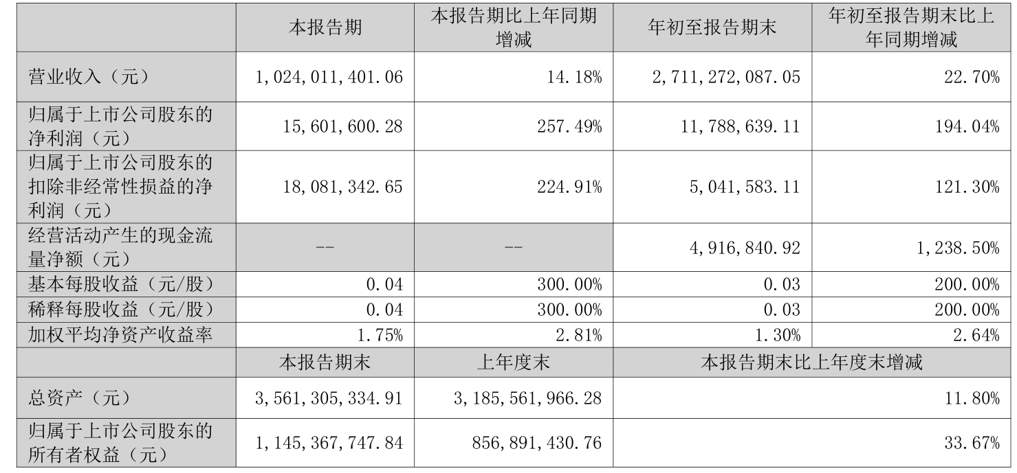 中证智能财讯温州宏丰(300283)10月27日披露2025年第三季度报告。前三季度公司实现营业总收入27.11亿元,同比增长22.70%;归母净利润1178.86万元,同比扭亏;扣非净利润504.16万元,同比扭亏;经营活动产生的现金流量净额为491.68万元,上年同期为-43.19万元;报告期内,温州宏丰基本每股收益为0.03元,加权平均净资产收益率为1.30%。