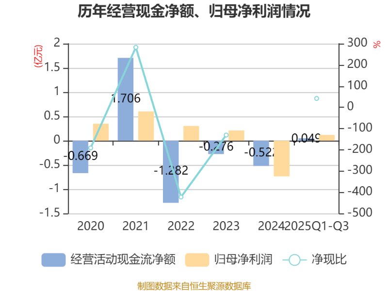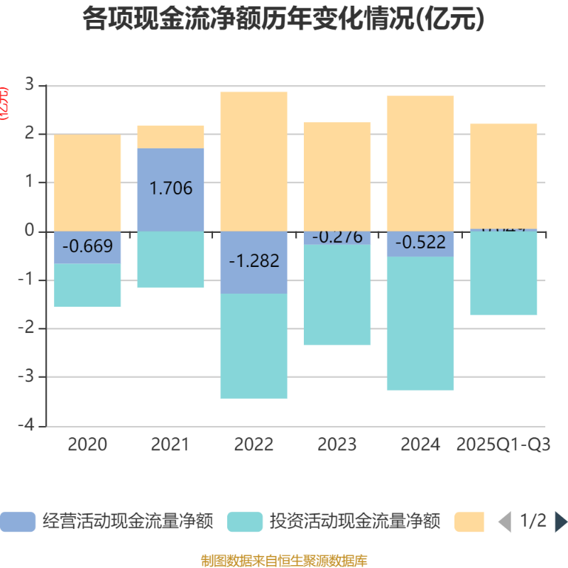 2025年前三季度,公司经营活动现金流净额为491.68万元,同比增加534.87万元;筹资活动现金流净额2.16亿元,同比减少3047.39万元;投资活动现金流净额-1.72亿元,上年同期为-2.86亿元。